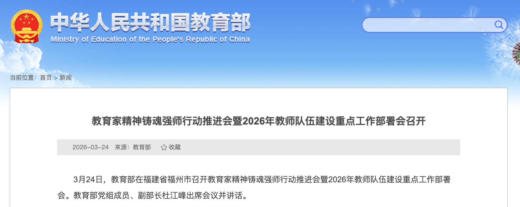 3月24日,教育部在福建省福州市召开教育家精神铸魂强师行动推进会暨2026年教师队伍建设重点工作部署会。教育部党组成员、副部长杜江峰出席会议并讲话。