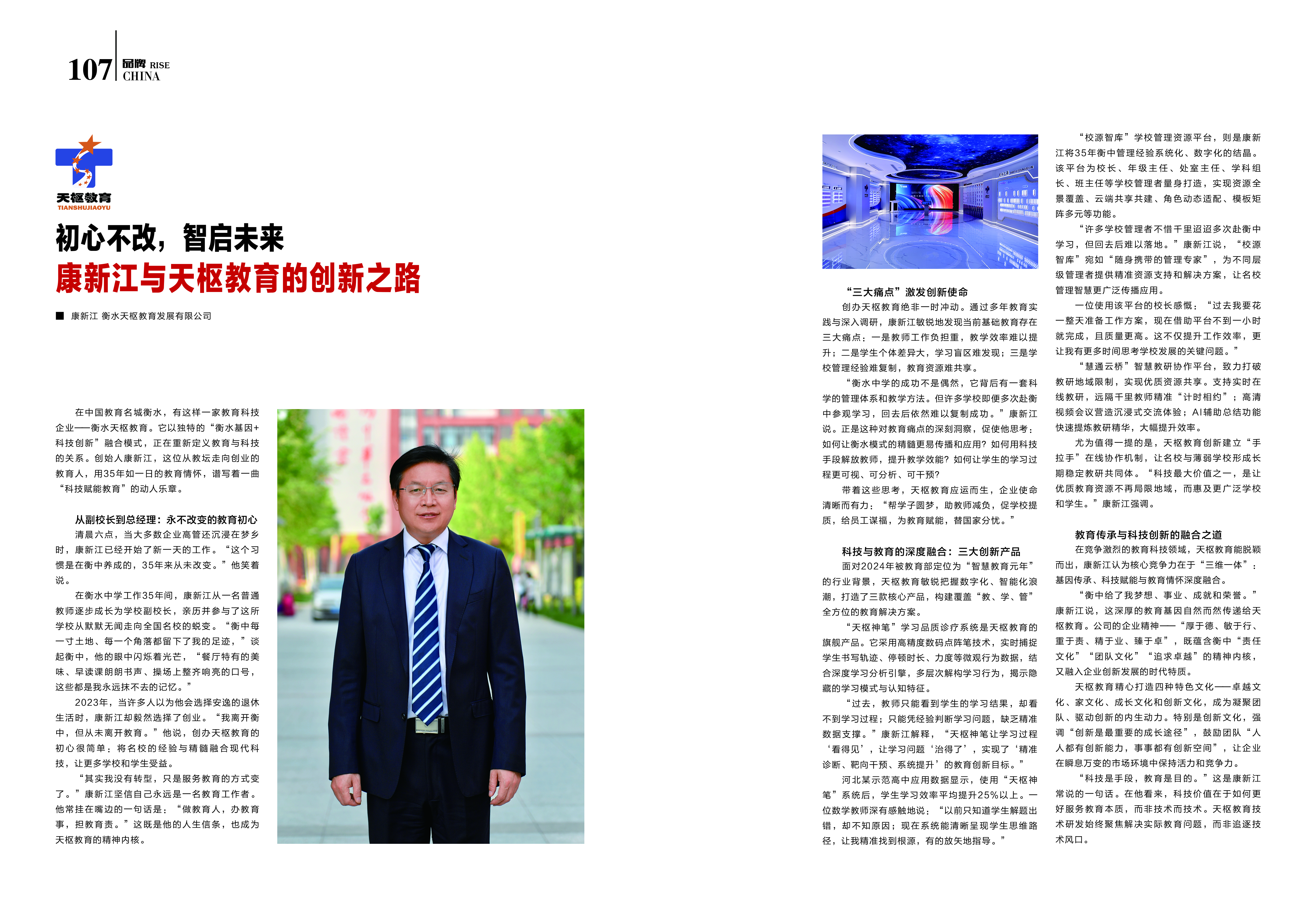 “从衡中到天枢,角色虽变,教育初心不改。”康新江坚定道,“天枢对我而言,不仅是一家企业,更是教育事业的延续。我将始终秉持'做教育人,办教育事,担教育责’信念,让科技真正为教育服务,为教育事业发展贡献力量。